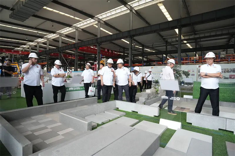 Во просторот за прикажување примероци од тули, вниманието на групата што го посети го привлекоа разни пропустливи тули, имитирани камени тули и рециклирани градежни материјали од цврст отпад. Фу Бингхуанг, претседател на Quangong Machinery Co., Ltd, објасни дека преку технолошко истражување и развој, Quangong Machinery Co., Ltd. го трансформира отпадот како градежен отпад и јаловина во градежни материјали со висока додадена вредност, еколошки прифатливи, отстранувајќи над 10 милиони тони цврст отпад годишно. Претседавачот Лиу Гуокуан ја прегледа јачината и пропустливоста на примероците од тули, пофалувајќи ја практиката на QGM за „трансформирање на отпадот во богатство“ како „модел на кружната економија“.
