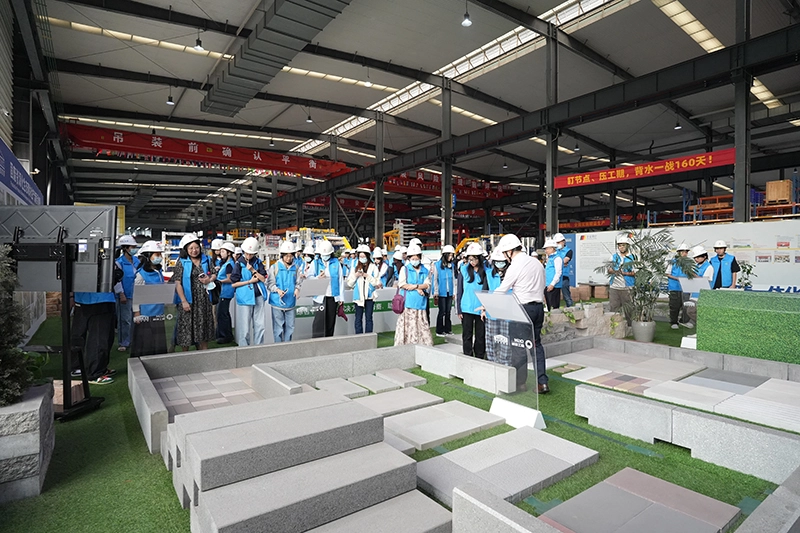 Во работилницата за производство на опрема, посетителите обиколија различни спецификации и апликации на производи произведени со употреба на машини за производство на тули на Quangong Machinery, вклучувајќи ѕидни блокови, камења за поплочување, материјали за контрола на поплави, еколошка заштита од наклон и потпорни ѕидови од гравитација. Во изложбениот простор, лабораторијата, работилницата за склопување и работилницата за дебагирање, посетителите дознаа за процесот на производство на производи на компанијата.