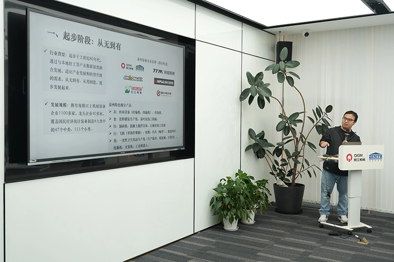 Во конференциската сала, персоналот од Одделот за опрема на Општинското биро за индустрија и информатичка технологија во Куанжу ја објасни основната ситуација, историјата на развојот и идните перспективи на индустријата за производство на опрема во Куанжу; беше прикажано и промотивно видео на Quanzhou Machinery Industry Co., Ltd.
